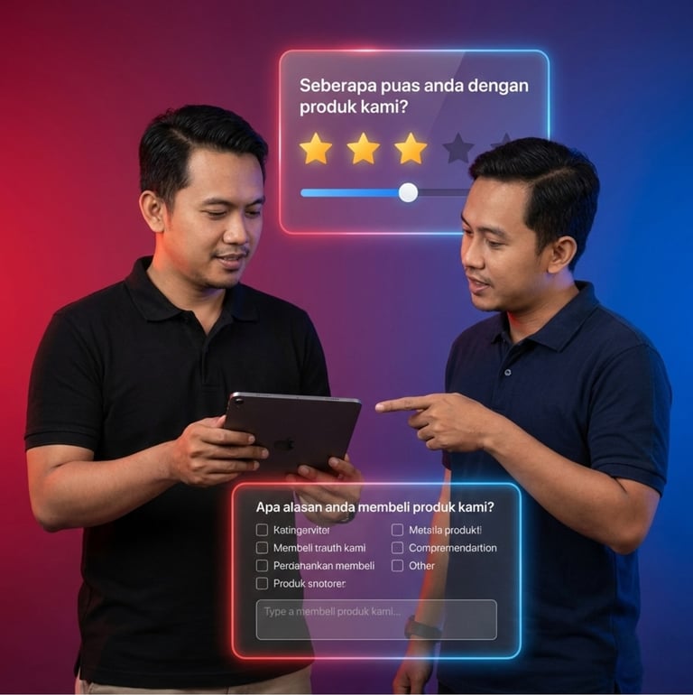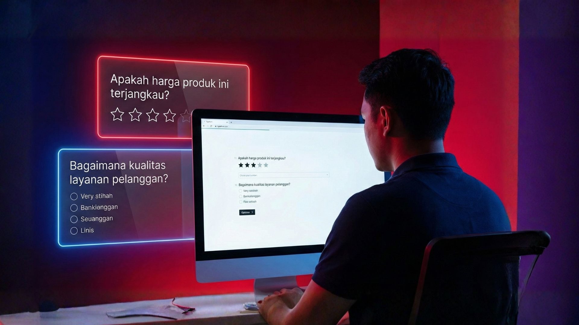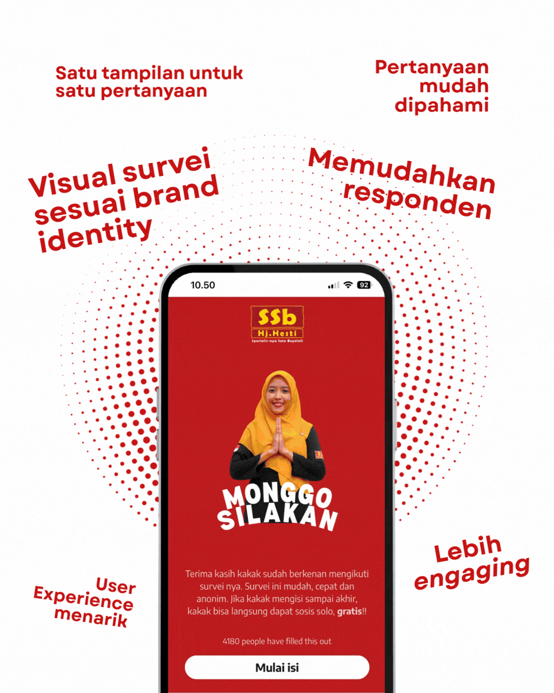 Tinggalkan form biasa dan beralih ke online survei kami yang memiliki tampilan lebih menarik dan professional. Selain itu, kami susun pertanyaan dan alur survei yang memudahkan responden serta minim bias agar jawaban lebih akurat.